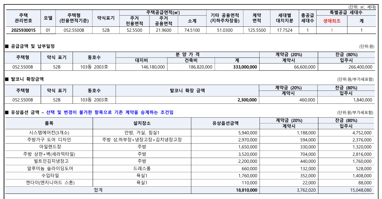 - 공급 세대: 전용면적 52㎡B형, 103동 2003호